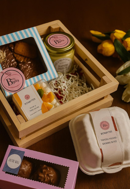 This hamper included a box of 4 signature brownies, mango mousse jar, mango tres leaches cake, pack of 2 rocher ball and ferrero rocher brownie bites
