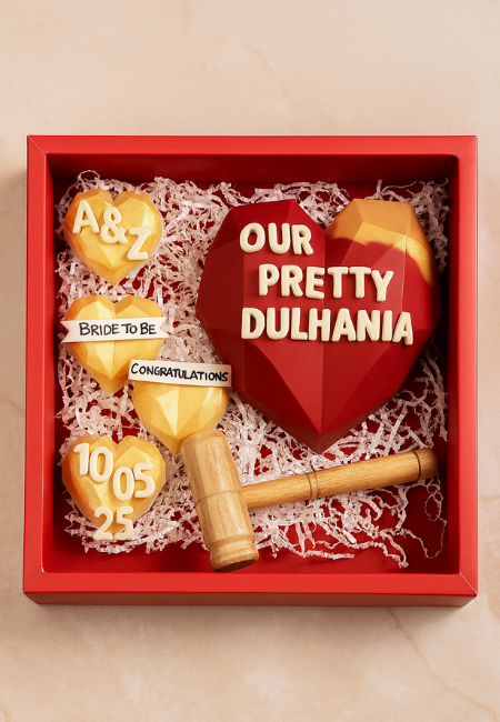 this piñata hamper includes one big heart pinata which has 4 fudge Brownie in it, 2 mini heartsicles, few chocolate bars and a hammer